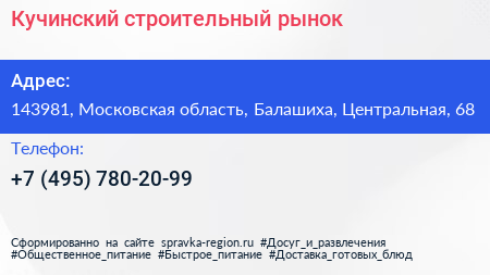 Кучинский, строительный рынок по адресу 143981, Московская область, Балашиха, Центральная, 68 в дальнейшем Организация, размещена в следующих категориях: