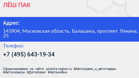 ЛЁШ ПАК по адресу 143904, Московская область, Балашиха, проспект Ленина, 25 в дальнейшем Организация, размещена в следующих категориях: