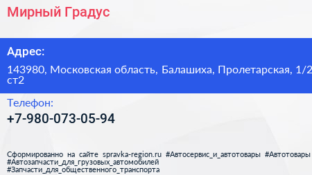 Мирный Градус по адресу 143980, Московская область, Балашиха, Пролетарская, 1/2 ст2 в дальнейшем Организация, размещена в следующих категориях: