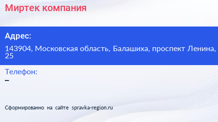 Миртек, компания по адресу 143904, Московская область, Балашиха, проспект Ленина, 25 в дальнейшем Организация, размещена в следующих категориях: