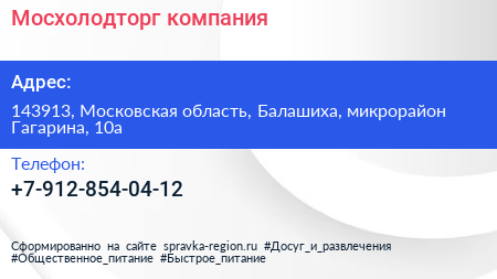 Мосхолодторг, компания по адресу 143913, Московская область, Балашиха, микрорайон Гагарина, 10а в дальнейшем Организация, размещена в следующих категориях: