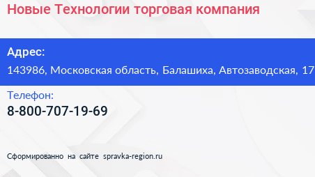 Новые Технологии, торговая компания по адресу 143986, Московская область, Балашиха, Автозаводская, 17 в дальнейшем Организация, размещена в следующих категориях: