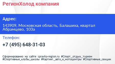 РегионХолод, компания по адресу 143909, Московская область, Балашиха, квартал Абрамцево, 103а в дальнейшем Организация, размещена в следующих категориях: