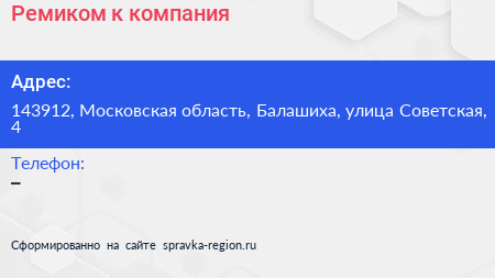 Ремиком-к, компания по адресу 143912, Московская область, Балашиха, улица Советская, 4 в дальнейшем Организация, размещена в следующих категориях: