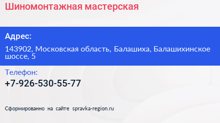 Шиномонтажная мастерская по адресу 143902, Московская область, Балашиха, Балашихинское шоссе, 5 в дальнейшем Организация, размещена в следующих категориях: