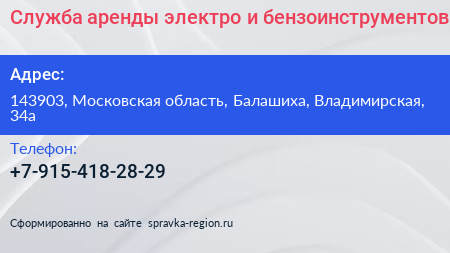 Служба аренды электро и бензоинструментов по адресу 143903, Московская область, Балашиха, Владимирская, 34а в дальнейшем Организация, размещена в следующих категориях: