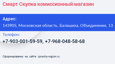 Смарт Скупка, комиссионный магазин по адресу 143905, Московская область, Балашиха, Объединения, 13 в дальнейшем Организация, размещена в следующих категориях: