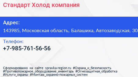 Стандарт Холод, компания по адресу 143985, Московская область, Балашиха, Автозаводская, 30 в дальнейшем Организация, размещена в следующих категориях: