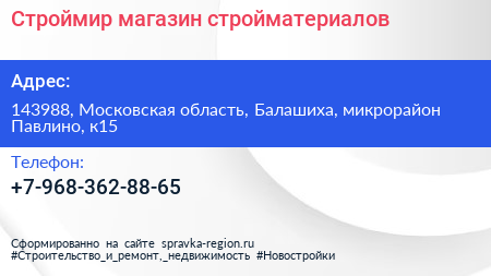 Строймир, магазин стройматериалов по адресу 143988, Московская область, Балашиха, микрорайон Павлино, к15 в дальнейшем Организация, размещена в следующих категориях: