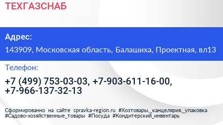 ТЕХГАЗСНАБ по адресу 143909, Московская область, Балашиха, Проектная, вл13 в дальнейшем Организация, размещена в следующих категориях:
