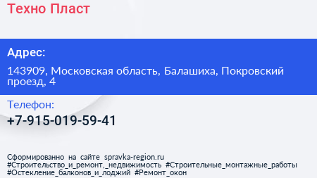 Техно-Пласт по адресу 143909, Московская область, Балашиха, Покровский проезд, 4 в дальнейшем Организация, размещена в следующих категориях: