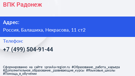 ВПК-Радонеж по адресу 11, улица Некрасова, ВНИИК (Всероссийский научно-исследовательский институт крахмалопродуктов), Коренёво, Красково, городской округ Люберцы, Московская область, Центральный федеральный округ, 140052, Россия в дальнейшем Организация, размещена в следующих категориях: