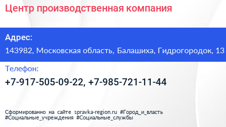 Центр, производственная компания по адресу 143982, Московская область, Балашиха, Гидрогородок, 13 в дальнейшем Организация, размещена в следующих категориях: