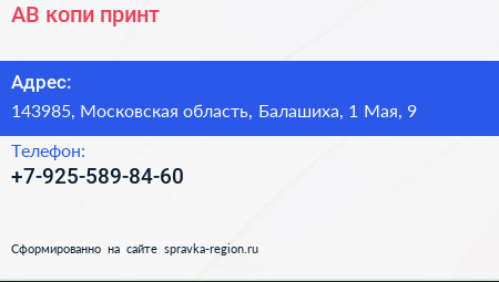 АВ копи-принт по адресу 143985, Московская область, Балашиха, 1 Мая, 9 в дальнейшем Организация, размещена в следующих категориях: