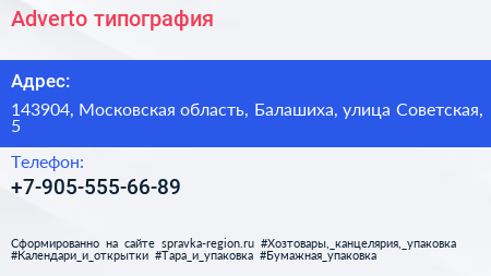 Adverto, типография по адресу 143904, Московская область, Балашиха, улица Советская, 5 в дальнейшем Организация, размещена в следующих категориях: