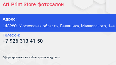 Art Print Store, фотосалон по адресу 143980, Московская область, Балашиха, Маяковского, 14а в дальнейшем Организация, размещена в следующих категориях: