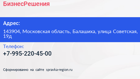 БизнесРешения по адресу 143904, Московская область, Балашиха, улица Советская, 19д в дальнейшем Организация, размещена в следующих категориях:
