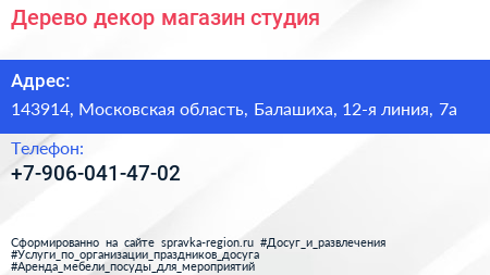 Дерево декор, магазин-студия по адресу 143914, Московская область, Балашиха, 12-я линия, 7а в дальнейшем Организация, размещена в следующих категориях: