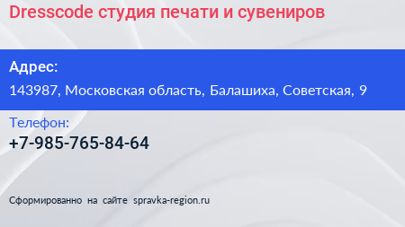 Dresscode, студия печати и сувениров по адресу 143987, Московская область, Балашиха, Советская, 9 в дальнейшем Организация, размещена в следующих категориях: