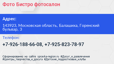 Фото Бистро, фотосалон по адресу 143923, Московская область, Балашиха, Горенский бульвар, 3 в дальнейшем Организация, размещена в следующих категориях:
