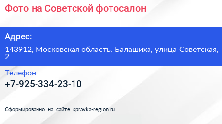 Фото на Советской, фотосалон по адресу 143912, Московская область, Балашиха, улица Советская, 2 в дальнейшем Организация, размещена в следующих категориях: