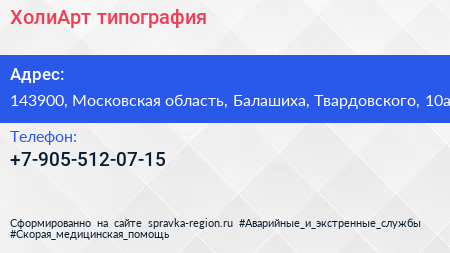 ХолиАрт, типография по адресу 143900, Московская область, Балашиха, Твардовского, 10а в дальнейшем Организация, размещена в следующих категориях:
