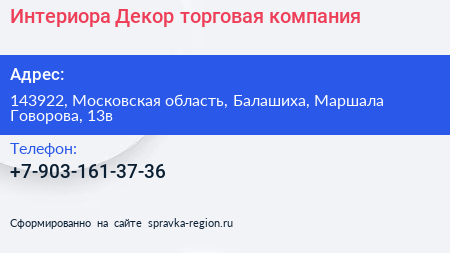 Интериора Декор, торговая компания по адресу 143922, Московская область, Балашиха, Маршала Говорова, 13в в дальнейшем Организация, размещена в следующих категориях: