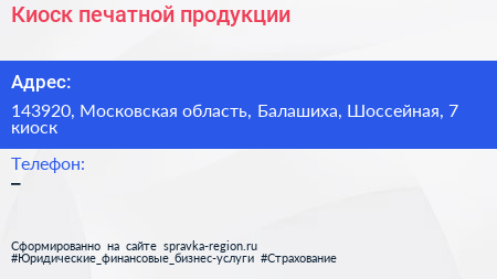 Киоск печатной продукции по адресу 143920, Московская область, Балашиха, Шоссейная, 7 киоск в дальнейшем Организация, размещена в следующих категориях: