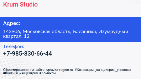 Krum Studio по адресу 143906, Московская область, Балашиха, Изумрудный квартал, 12 в дальнейшем Организация, размещена в следующих категориях: