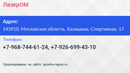 ЛазерОМ по адресу 143910, Московская область, Балашиха, Спортивная, 17 в дальнейшем Организация, размещена в следующих категориях: