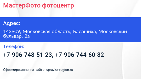 МастерФото, фотоцентр по адресу 143909, Московская область, Балашиха, Московский бульвар, 2а в дальнейшем Организация, размещена в следующих категориях:
