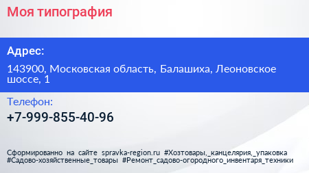 Моя типография по адресу 143900, Московская область, Балашиха, Леоновское шоссе, 1 в дальнейшем Организация, размещена в следующих категориях: