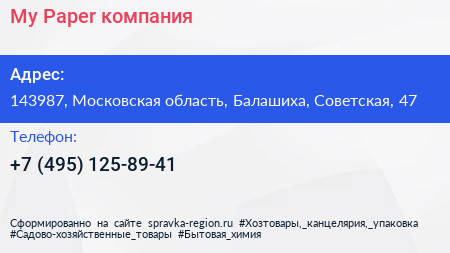 My Paper, компания по адресу 143987, Московская область, Балашиха, Советская, 47 в дальнейшем Организация, размещена в следующих категориях: