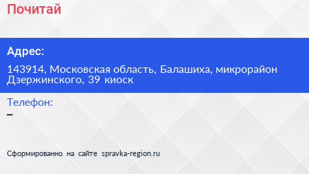 Почитай по адресу 143914, Московская область, Балашиха, микрорайон Дзержинского, 39 киоск в дальнейшем Организация, размещена в следующих категориях: