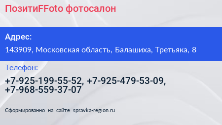 ПозитиFFoto, фотосалон по адресу 143909, Московская область, Балашиха, Третьяка, 8 в дальнейшем Организация, размещена в следующих категориях: