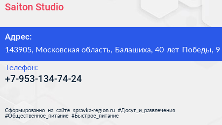 Saiton.Studio по адресу 143905, Московская область, Балашиха, 40 лет Победы, 9 в дальнейшем Организация, размещена в следующих категориях: