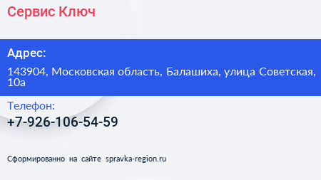 Сервис Ключ по адресу 143904, Московская область, Балашиха, улица Советская, 10а в дальнейшем Организация, размещена в следующих категориях: