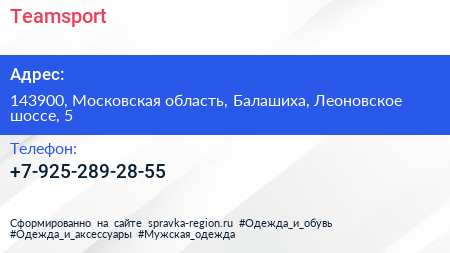 Teamsport по адресу 143900, Московская область, Балашиха, Леоновское шоссе, 5 в дальнейшем Организация, размещена в следующих категориях: