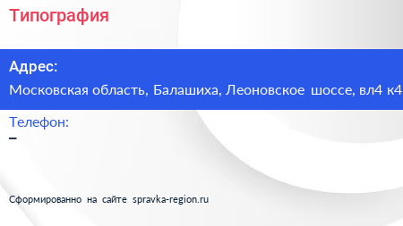 Типография по адресу Московская область, Балашиха, Леоновское шоссе, вл4 к4 в дальнейшем Организация, размещена в следующих категориях: