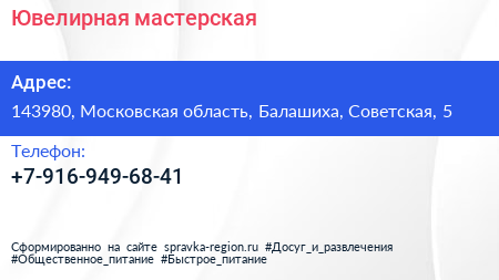 Ювелирная мастерская по адресу 143980, Московская область, Балашиха, Советская, 5 в дальнейшем Организация, размещена в следующих категориях: