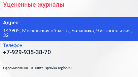 Уцененные журналы по адресу 143905, Московская область, Балашиха, Чистопольская, 32 в дальнейшем Организация, размещена в следующих категориях: