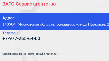 ЗАГС-Сервис, агентство по адресу 143904, Московская область, Балашиха, улица Парковая, 2 в дальнейшем Организация, размещена в следующих категориях:
