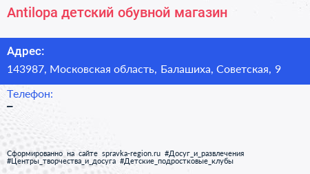 Antilopa, детский обувной магазин по адресу 143987, Московская область, Балашиха, Советская, 9 в дальнейшем Организация, размещена в следующих категориях: