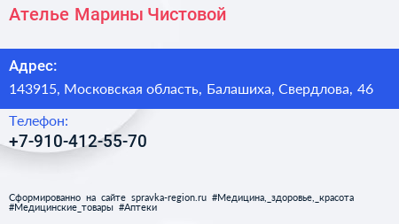 Ателье Марины Чистовой по адресу 143915, Московская область, Балашиха, Свердлова, 46 в дальнейшем Организация, размещена в следующих категориях:
