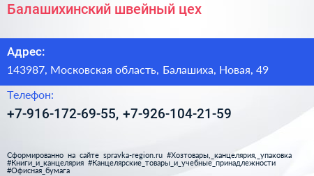 Балашихинский швейный цех по адресу 143987, Московская область, Балашиха, Новая, 49 в дальнейшем Организация, размещена в следующих категориях: