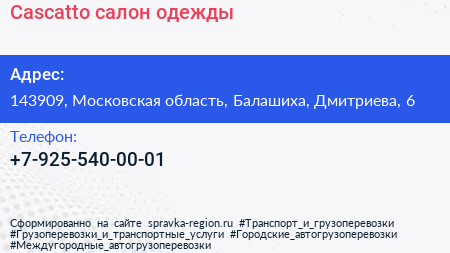 Cascatto, салон одежды по адресу 143909, Московская область, Балашиха, Дмитриева, 6 в дальнейшем Организация, размещена в следующих категориях: