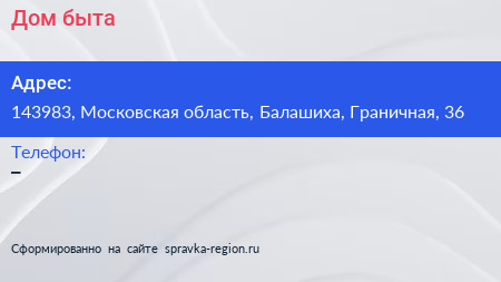 Дом быта по адресу 143983, Московская область, Балашиха, Граничная, 36 в дальнейшем Организация, размещена в следующих категориях: