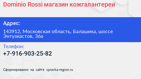Dominio Rossi, магазин кожгалантереи по адресу 143912, Московская область, Балашиха, шоссе Энтузиастов, 36а в дальнейшем Организация, размещена в следующих категориях: