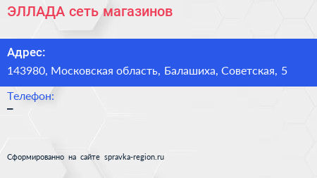ЭЛЛАДА, сеть магазинов по адресу 143980, Московская область, Балашиха, Советская, 5 в дальнейшем Организация, размещена в следующих категориях: