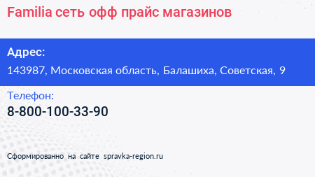 Familia, сеть офф-прайс магазинов по адресу 143987, Московская область, Балашиха, Советская, 9 в дальнейшем Организация, размещена в следующих категориях: